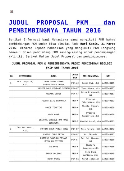 Panitia workshop pkm 2012 badan eksekutif mahasiswa fakultas teknik universitas muhammadiyah surakarta gedung f sayap selatan jln. Dan akan diperdalam lagi di dua minggu awal kegiatan pkm. Pengusulan proposal dan pendanaan pkm. Proposal program kreativitas mahasiswa judul program bangka belitung (bakso angka . Tutorial unggah proposal · surat pernyataan · contoh lembar pengesahan